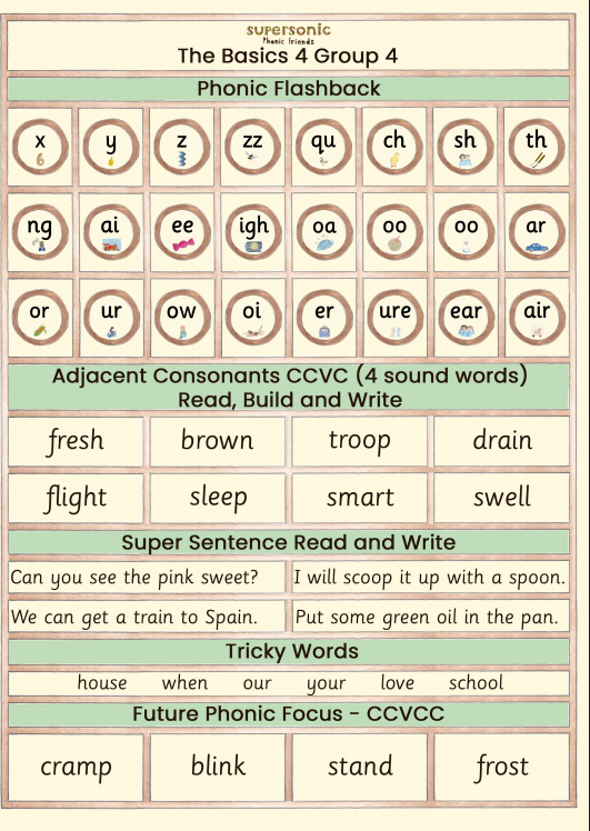 Year 1 will be continuing with the basics 4, reading and writing CVCC words. See the learning leaflet below.